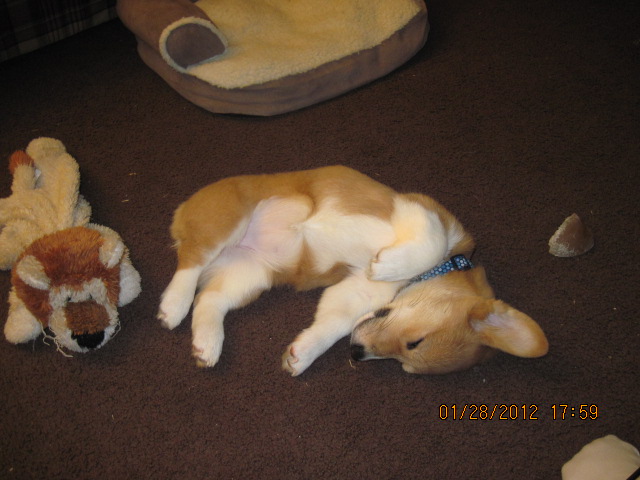 So time passed and I put the conversation in the back of my mind, but didn't forget it. :) Imagine my surprise and excitement when she called me in November and told me they had puppies! And here is what I think is the neat part- first- we actually had the money at the time she called to get a puppy, and she was charging a very reasonable price. Second- at the pet store she works at, they wear different aprons at different times.. and shortly after the puppies were born, she put on a different apron, and it was the one that had my card in the pocket, which jogged her memory of our conversation. Three- my husband said yes to buying one, even though he joked about Corgis being "mutant" dogs. (And now Ginger has him wrapped around her paw. ;) ) Four- we wanted a girl puppy and there was only one girl in the litter. :) Now tell me it wasn't meant to be that we have Ginger! :) She's only been with us about two months and I can't imagine life without her now. ♥